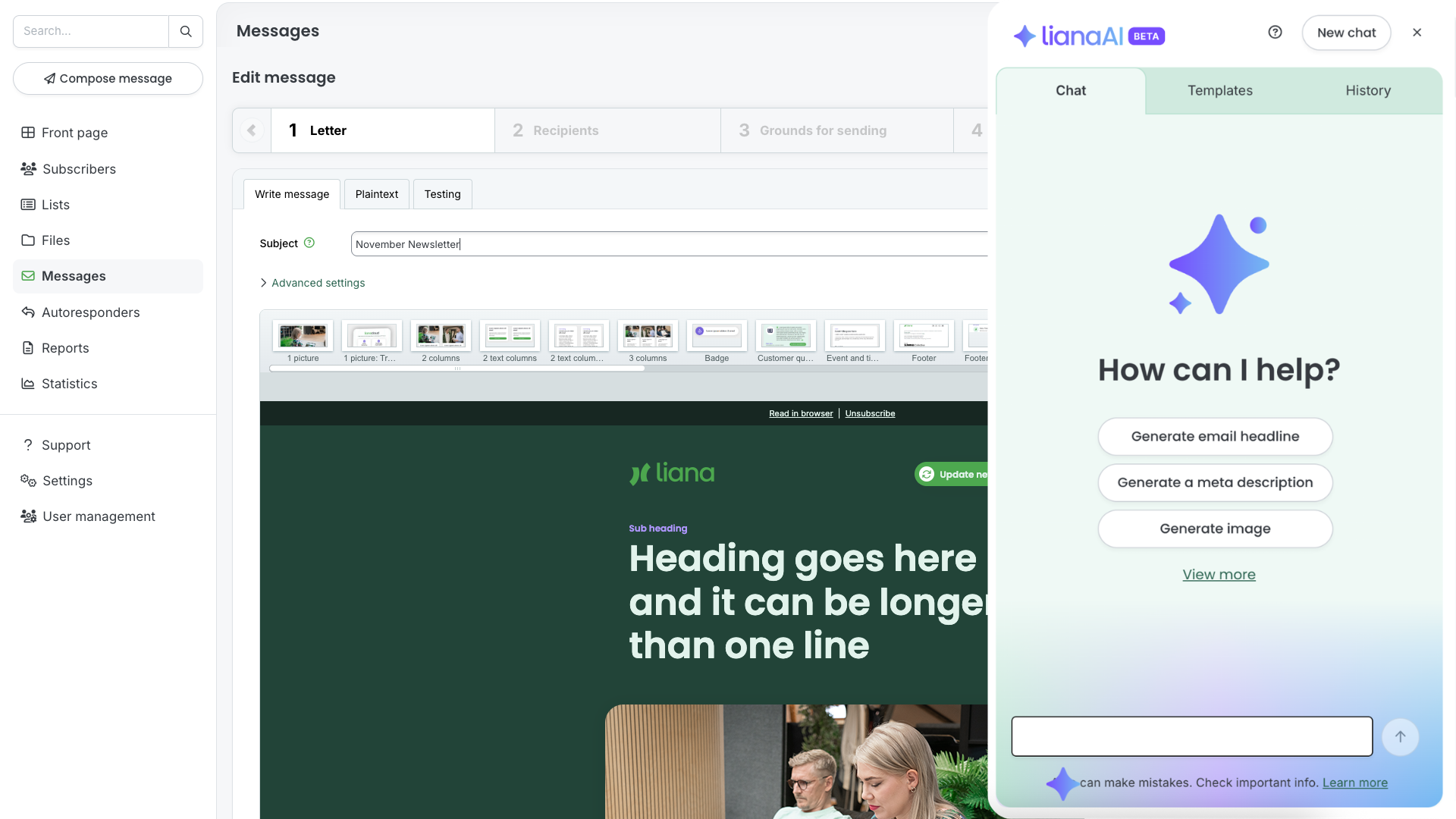 Liana's AI assistant saves you hours of work time by letting you ideate with it about the content you need, conveniently within the tool.